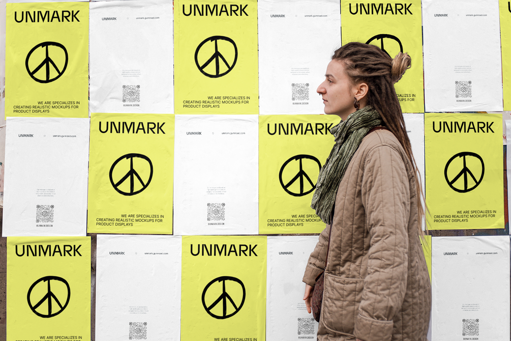 Mockup with posters in the background and with a girl in the foreground. Chess layout of posters. Mockups for branding / identity designers. The mockup is made on the basis of photographs and has natural shadows and reflection